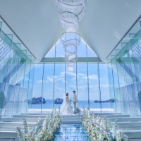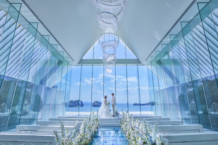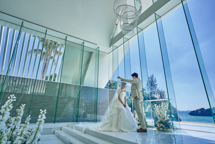 光と水、沖縄の自然が演出する"五感の教会"「アイネス ヴィラノッツェ 沖縄」。 セント・ジョセフ・チャペルは五感(観る、触れる、香る、食す、聴く)で感じることのできる挙式をコンセプトに設計されており、チャペルは全面ガラス張りのオーシャンフロントチャペル。 チャペルの扉を開けた瞬間に視界に飛び込んでくる青い海が広がる景色は、「ふたりの未来」が輝いていることを予感させてくれます。
